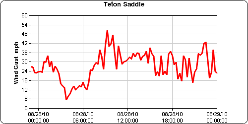 Seth and I slowly made our way up to the Saddle. The clouds were still dark gray and the wind was whipping. Just below the saddle is a cliff band that intersects the top of the Middle Teton Glacier. There is a route that traverses the snow field onto the top of the cliff band and a route with a hand line up a crack in the cliff band. Standard class 4 scrambling stuff with the rope to give you a bit extra security. We paused at the base while several parties made their way down. They were Exum Mountain Guides and their clients who due to the weather were turning back. This made Seth and I feel a bit better about our decision to not climb at 3:30 am. As we got up onto the saddle the gusts of wind became even more intense. A wind anemometer on the saddle showed the gusts were hitting over 50 mph. At the saddle you could look across the gulf into Idaho at Table Rock a peak at 11,600 feet that I'd hiked many many years ago as an 18 year old assistant scout master. Dark clouds rumbled on the horizon and were blowing our way. All this further ratified our decision to turn back. At this point we decided not to even opt for the Middle and after wandering around for a while we headed back down to camp.