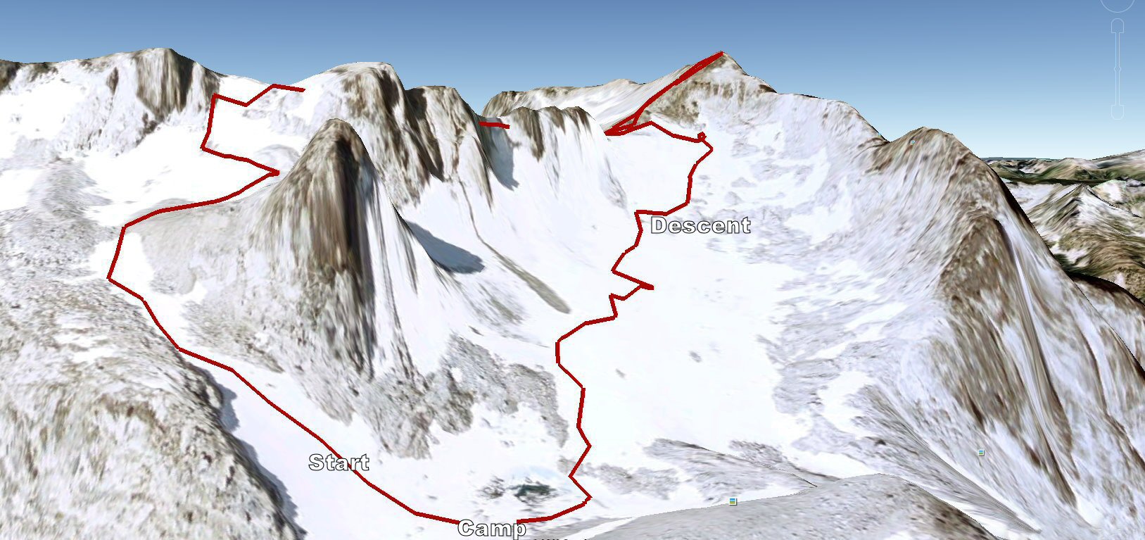 We started up the snowfield, kicking steps in the hard névé; the slope quickly grew steeper and the snow harder. Too steep to put on crampons (which we should have started out in) I ended up chopping steps with my ice axe until we reached the first rock band where we could sit and don the crampons. Sharp points on your feet make the going so much easier, we settled into the rest step and plodded our way up. The snow ran out a hundred yards before the top of the ridge and we took off the sharpies and scrambled up the rock and gravel. At the top was a bowl with the proper ridge still ahead and above us several hundred feet higher, a smaller but easier attained ridge ran perpendicular to the main ridge to the rocky spire of Witches Tower. We hiked up to this cross ridge to peer back down a steep cliff into the far corners of Snowcreek snowfield. We descended back into the bowl and had two options : traverse farther east away from the summit to gain the ridge at the Little Anapurna col or head up a more direct small snow field and scramble some 50 feet of rock to the ridge. The question was the rock, but it looked like it might go, there were cliff bands and ledges.