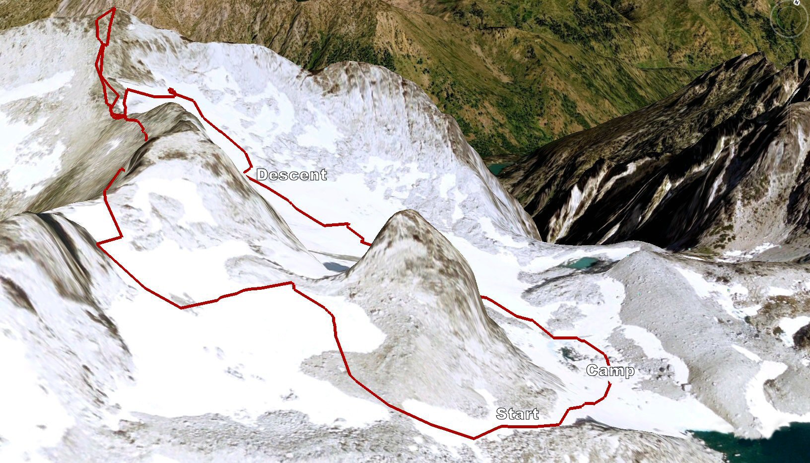 We walked along the ridges meadow and talus until we came to the col above the Snowcreek Glacier/snowfield. From here the summit is a walk up to the highest point. A small biivy spot sits just below the final summit stones. The rocky "dragon" spires of the ridgeline look south with Colchuck and Stuart in the beyond. We rested for a few minutes, posed for our summit shot and then started down. The day wasn't long left for light and we had a ways to go before dark. Given it was 5pm I was game to have a look at descending the Snowcreek Glacier. At the saddle, I jumped down onto the top of the snowfield to have a look. The slope was steep, there was lots of ice below, but there looked to be a line we could traverse. Jason really didn't want to even look, exasperatedly he jumped down onto the snow and peered over the edge. We agreed to swing to the left (west) end of the snowfield and descend to the rock and then make our circuitousness way down and as we got lower to head east toward camp.