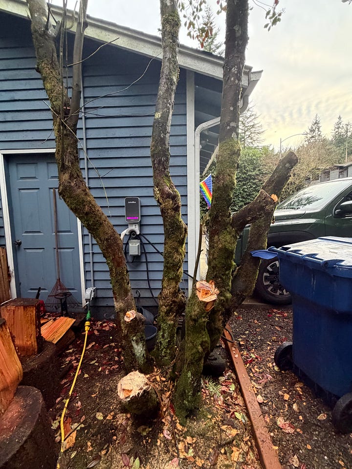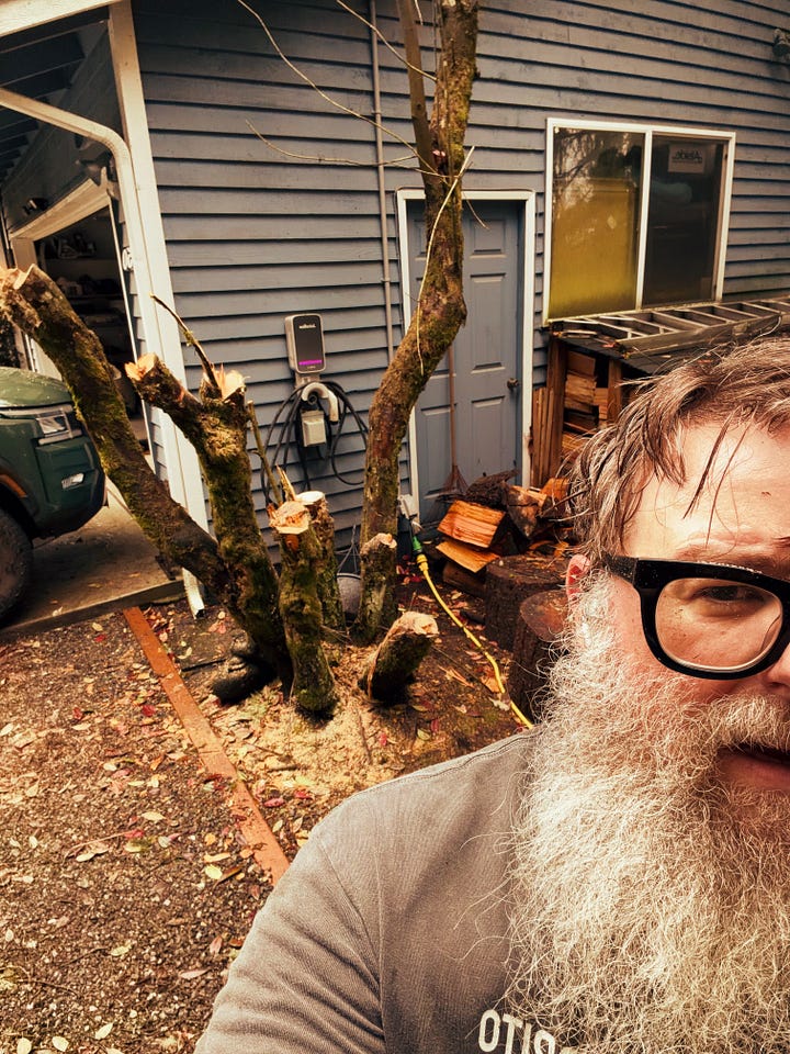 See it has like 6 trunks? And that wood was super dense, wet and full of water. I cut it down mostly with my electric chainsaw (which is not really suited for this task) and then I cut off the branches and carried very heavy logs (sometimes with Miles help) down to the back forty for them to decompose.