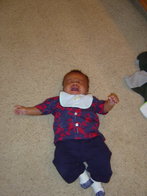 Miles in his Hawaiin shirt looking a lot like his daddy, crying