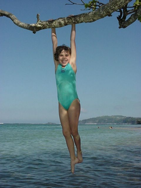 Kiah hanging from the tree limb.
