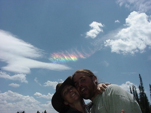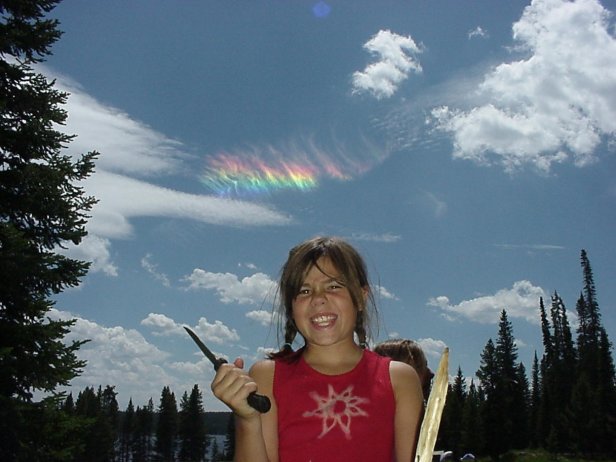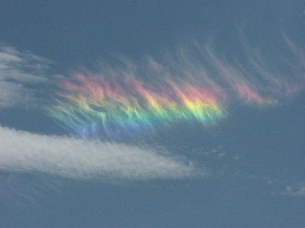 One afternoon the most amazing weather phenomenon appeared in the sky. There was no rain and hardly a cloud in the sky, but a wisp of clouds were colored with the spectrum of a rainbow. Must have been the reflection of the sun off the lakes surface.