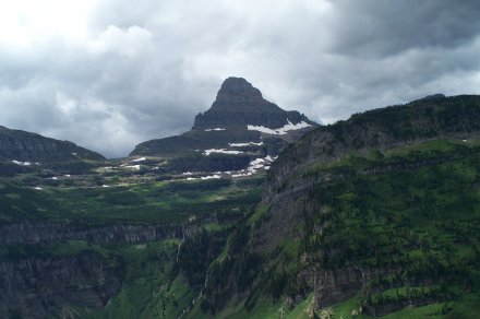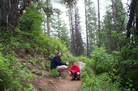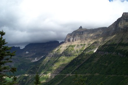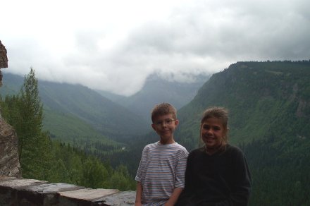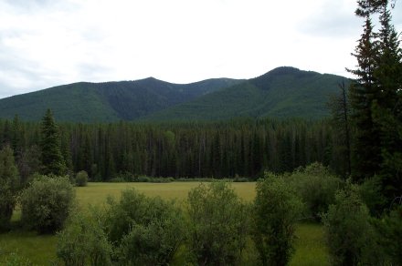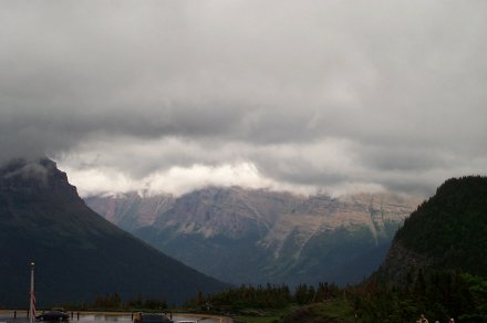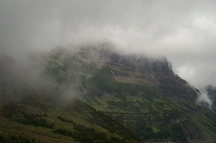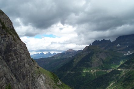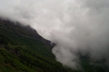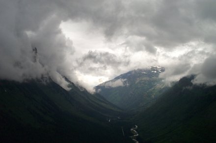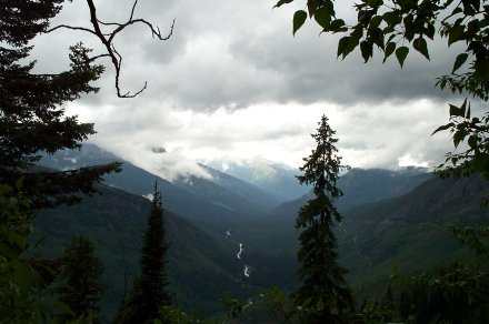 And we decided to turn back anyway after a ranger came back reporting a grizzley up ahead who didn't seem afraid of humans. Due to the storm it was quite cloudy on the way up. Here is a picture looking back down the valley from whence we came. The small line to the left of the river is the road (clearer in the bigger view).