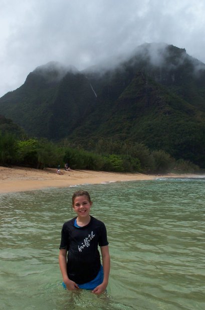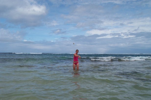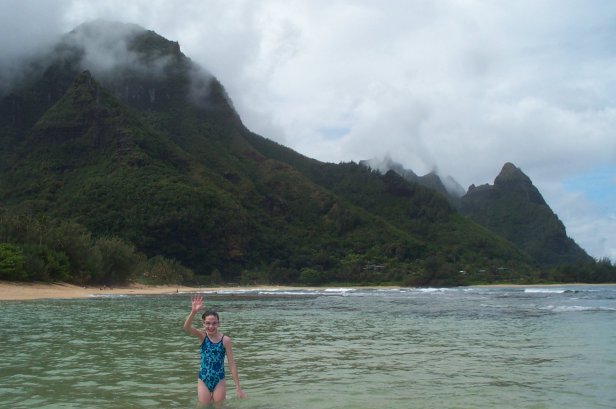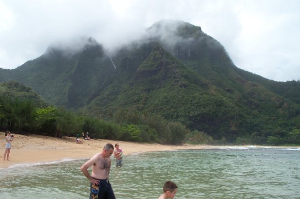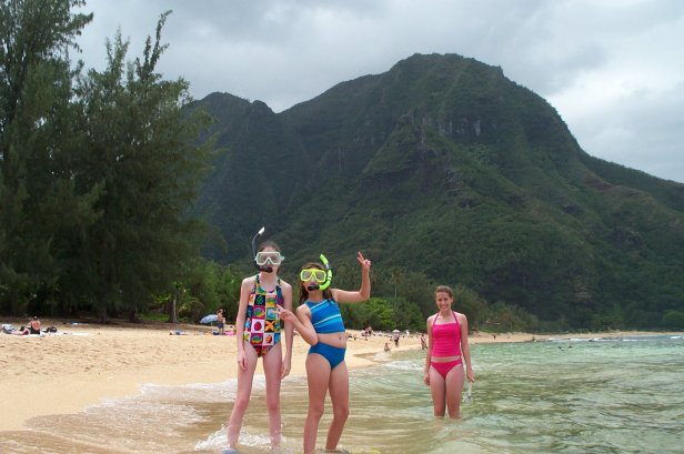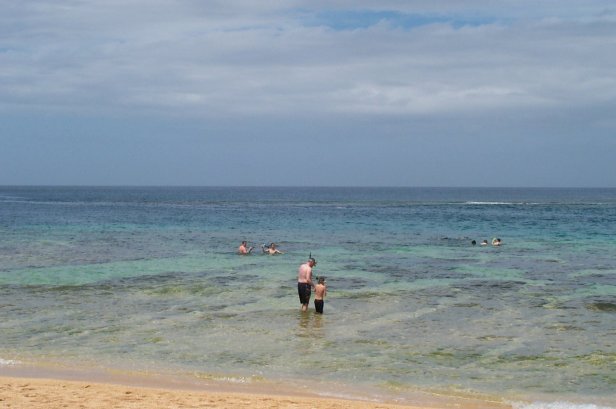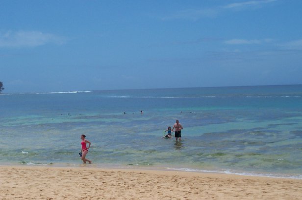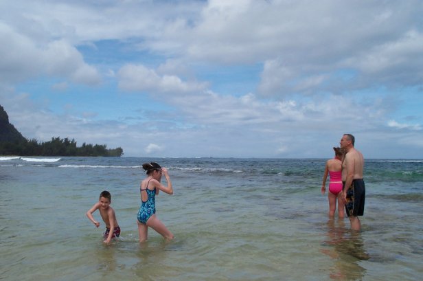 Megan, Kristen and Craig coming in from snorkling, you notice the reef right next to the beach, then the blue band and then more reef much further out. This is what makes Tunnels such a great beach is that the waves break way out on the outer reef, then the big middle stretch and the reef close in makes for great snorkling. I wanted to Scuba dive this spot, but the rain and swell made the dive shop cancel.