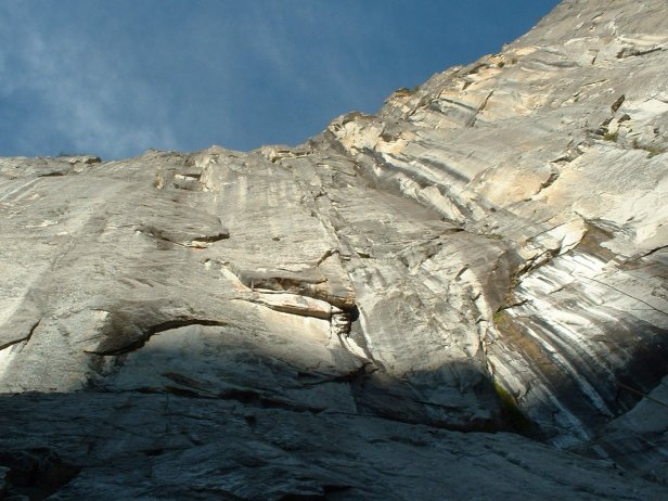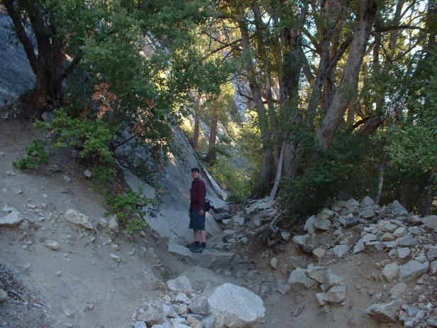 As you turn the corner and start up towards the top of the ridge the canyon walls rise very dramatically above your head, it is hard to believe how far back you have to crank your head to see the top. This is the point at which the hike turns down right mean, here you begin a set of switch backs that cross a littered stretch that is covered in small granit rocks. Trail work has stacked these into what can loosely be called steps. Each "step" is irregular and requires tedious and treacherous attention.