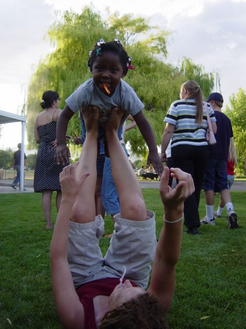 Sofi riding high on Bob's feet sucking on a peice of candy.