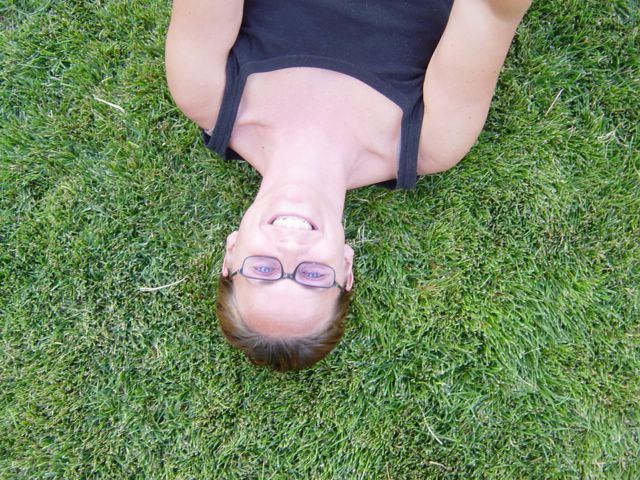 Jen Nuttal, lying on the ground giving kids rids on her feet.