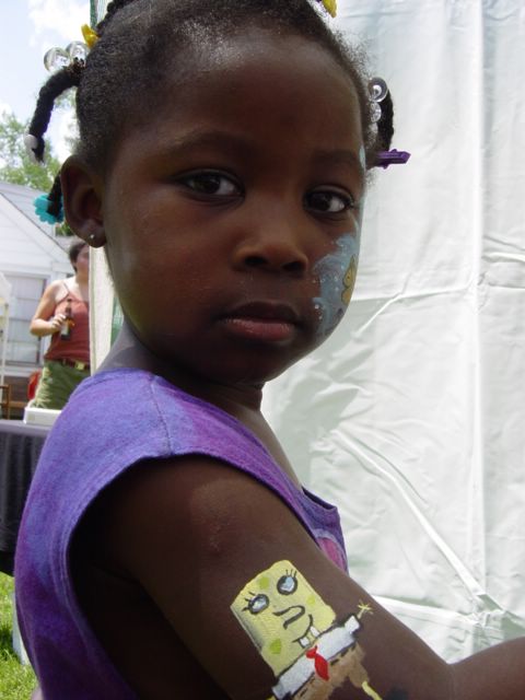 Sofi and her Spong Bob Square Paints "face painting" on her arm, by the end of the day she had well over 10 different paintings.
