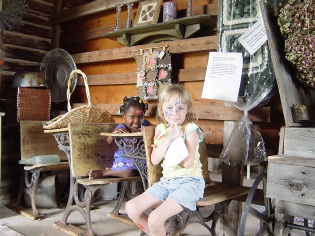 Kiah and a little friend playing school in the shop on the farm.