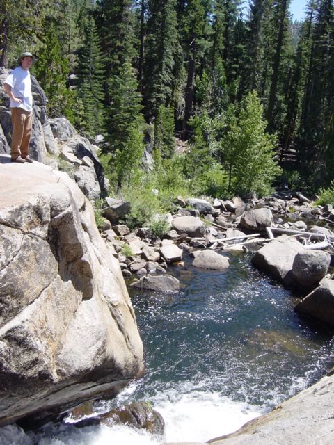 Larry on top of Stud Rock, the drop is around 25 feet or so, but the scariest part is making sure you hit the water at the right place, just outside where the foam dissipates.