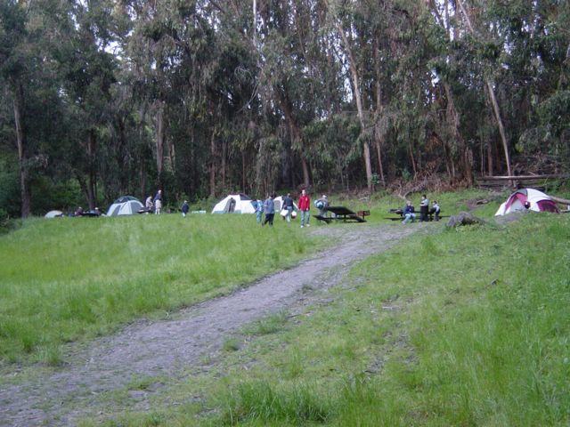 Everyone camped up on the hill above the meadow among the eucalyptus trees.