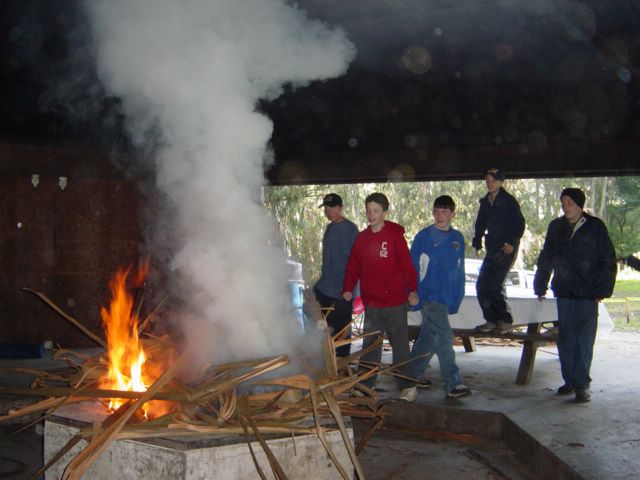 Fire! All boys are pyromaniacs. Burning stuff in the fire, is one of the great past-times of camping. They continually gathered up eucalyptus bark and piled it on the fire for a roaring, but quick dying fire.