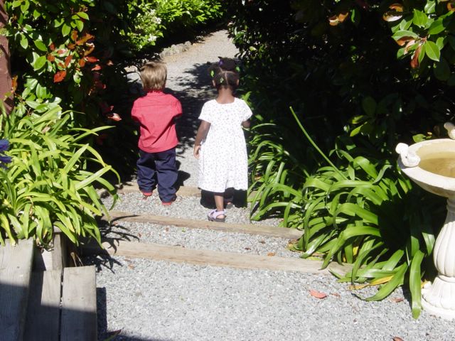 Arlo and Sofi heading down the stairs through the garden